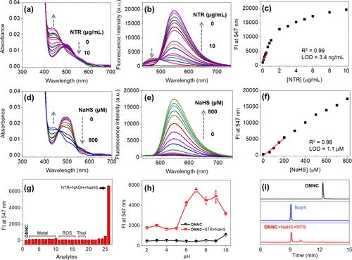 在PBS溶液中,DNNC表现出特定的吸收带,且在激发下几乎不发光。与此相对,未锁定的Naph在相同条件下显示出强烈的荧光。通过比较DNNC与单锁定系统NNC和DN的吸收和荧光特性,研究发现NC基团导致荧光发射的蓝移,而NBD基团则显著减弱了荧光强度。重要的是,DNNC在NTR和H2S共存时表现出显著的荧光增强,其信噪比远高于单锁定系统。