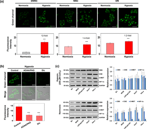 DNNC在HeLa细胞中的荧光反应证实了其在活细胞分析中的实用性。在不同细胞系中,DNNC的荧光反应与H2S和NTR的活性密切相关,特别是在缺氧条件下。通过使用H2S和NTR的抑制剂,进一步证实了DNNC的荧光反应是由这两种生物标志物引起的。此外,DNNC在HeLa细胞球体模型中显示出强烈的绿色荧光,尤其是在模拟体内缺氧环境的内部区域。