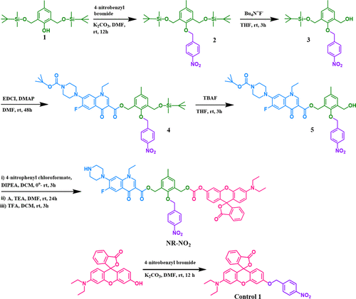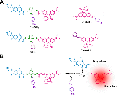 研究团队合成了一种缺氧激活治疗原药NR-NO2,以及几种对照探针。NR-NO2原药由三部分构成:罗丹明荧光团(用于发射荧光)、4-硝基苄基(用于缺氧感应)以及诺氟沙星(作为药物成分)。原药和探针共用一种激活方式,因此当4-硝基苄基连接到甲酚时,细胞毒性和内在荧光效应会受到抑制。