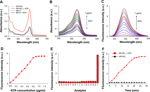 图 3.硝基还原酶(NTR)处理前后 NR-NO2 和 NR-H 的光物理特性。(A) 在 NTR 存在和不存在的情况下记录的 NR-NO2 和 NR-H (10 μM)的紫外吸收光谱。在不同浓度的 NTR(0-1 μg/mL)存在下记录的 NR-NO2 的荧光吸收(B)和发射(C)(λex = 525 nm)光谱。(D) 在不同 NTR 浓度下测定的 NR-NO2(10 μM)的发射强度。(E) 在血清中存在不同潜在干扰物的情况下记录的 NR-NO2 探针(10 μM)的荧光响应:(F)在 NTR(0.5 μg/mL)存在下观察到的 NR-NO2 (10 μM)发射强度随时间的变化。