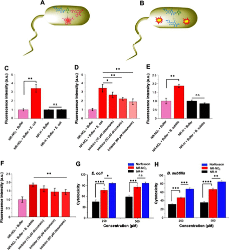 图 2.NR-NO2 检测和杀死活细菌。(A) NR-NO2 在细菌中的荧光增强机制示意图;(B) 导致细菌细胞毒性的活性药物释放机制。(C)在不同浓度的抑制剂存在下,大肠杆菌细胞裂解液的荧光强度,以及进一步记录的荧光强度(D)。(E) B. subtilis 在琼脂培养基中生长两小时后细胞裂解物的相对荧光强度,以及 (F) 用不同浓度的双香豆素处理后记录的荧光强度。NR-NO2、NR-H 或诺氟沙星在(G)大肠杆菌和(H)枯草杆菌存在下培养 24 小时后的细胞毒性。