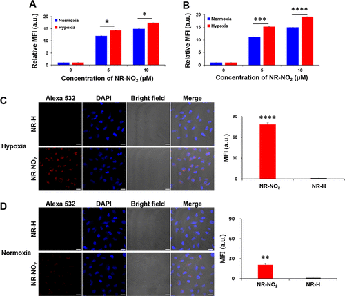 图 3.A549 和 HeLa 细胞的体外荧光成像。在缺氧和常氧条件下培养 8 小时后,用 NR-NO2 和 NR-H(5 和 10 μM)处理 30 分钟的(A)A549 细胞和(B)HeLa 细胞的荧光激活细胞分拣(FACS)。在缺氧(C)和常氧(D)条件下,用 NR-NO2 或 NR-H(10 μM)培养 30 分钟的 A549 细胞的代表性共焦激光扫描显微镜(CLSM)图像。