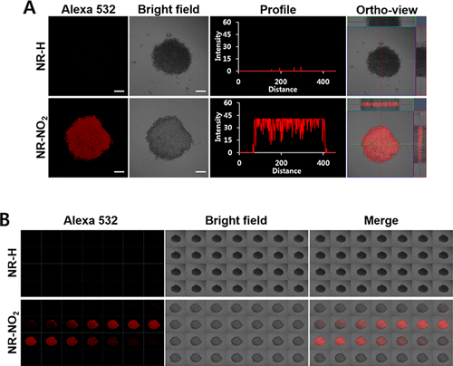 图 4.用 NR-NO2 或 NR-H 培养 A549 细胞球的体外荧光成像。