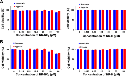 图 5.用不同浓度的 NR-NO2 或 NR-H(0、3.125、6.25、12.5、25、50 和 100 μM)处理 A549(A)和 HeLa(B)细胞,测量细胞毒性.