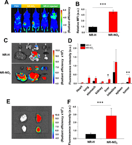 图 6.基于体内和体外荧光成像的肿瘤检测。(A) 与 PBS 或对照组相比,NR-NO2 组和 NR-H 组A549 肿瘤小鼠(n = 5)在治疗后 17 h 的体内光学图像;(B) 两组在肿瘤区域的相应定量比较。(C) 两组小鼠(1)心脏、(2)肺、(3)胃、(4)肾脏、(5)肝脏、(6)肠道、(7)脾脏和(8)肿瘤等多个器官在 29 h 后提取的代表性体外荧光图像,以及(D)器官和肿瘤荧光强度的相应比较。(E)肿瘤组织(n = 4)的体外荧光图像,以及 NR-NO2 组和 NR-H 组荧光强度的定量比较(F)。