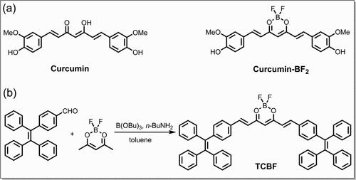 在本研究中,研究人员通过克诺文纳格尔缩合反应,成功合成了一种新型的四苯基乙烯(TPE)功能化姜黄素-BF2(TCBF)复合物。这种D-π-A-π-D结构的复合物不仅保持了TPE的AIE活性,还将其发射颜色扩展到了红光区域,显示出长期的光稳定性。