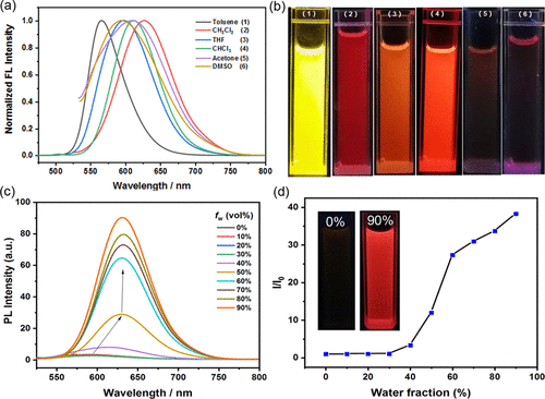 TCBF在不同溶剂中展现出高度可调的荧光发射,其荧光量子产率在不同溶剂中变化显著,表明了其出色的溶剂敏感性。在H2O/DMSO混合物中,TCBF表现出明显的AIE特性,随着水的比例增加,荧光强度显著增加,且发射峰红移,显示出强烈的红色荧光。