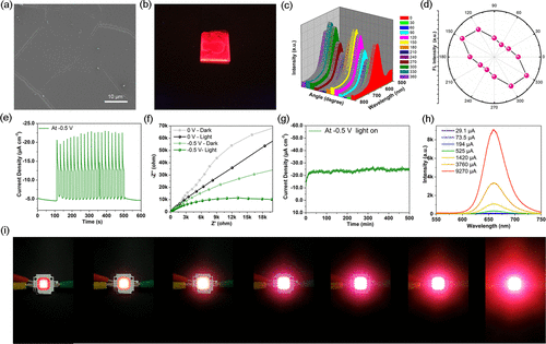 TCBF薄膜在光电测量中表现出了优异的稳定性,即使在持续500分钟的测试中,光电流密度也几乎没有衰减。此外,通过在商用蓝光芯片上涂覆TCBF粉末和有机硅胶,研究人员成功制造了荧光粉转换的红色LED器件,其发射强度随着驱动电流的增加而增强,显示出良好的线性关系。