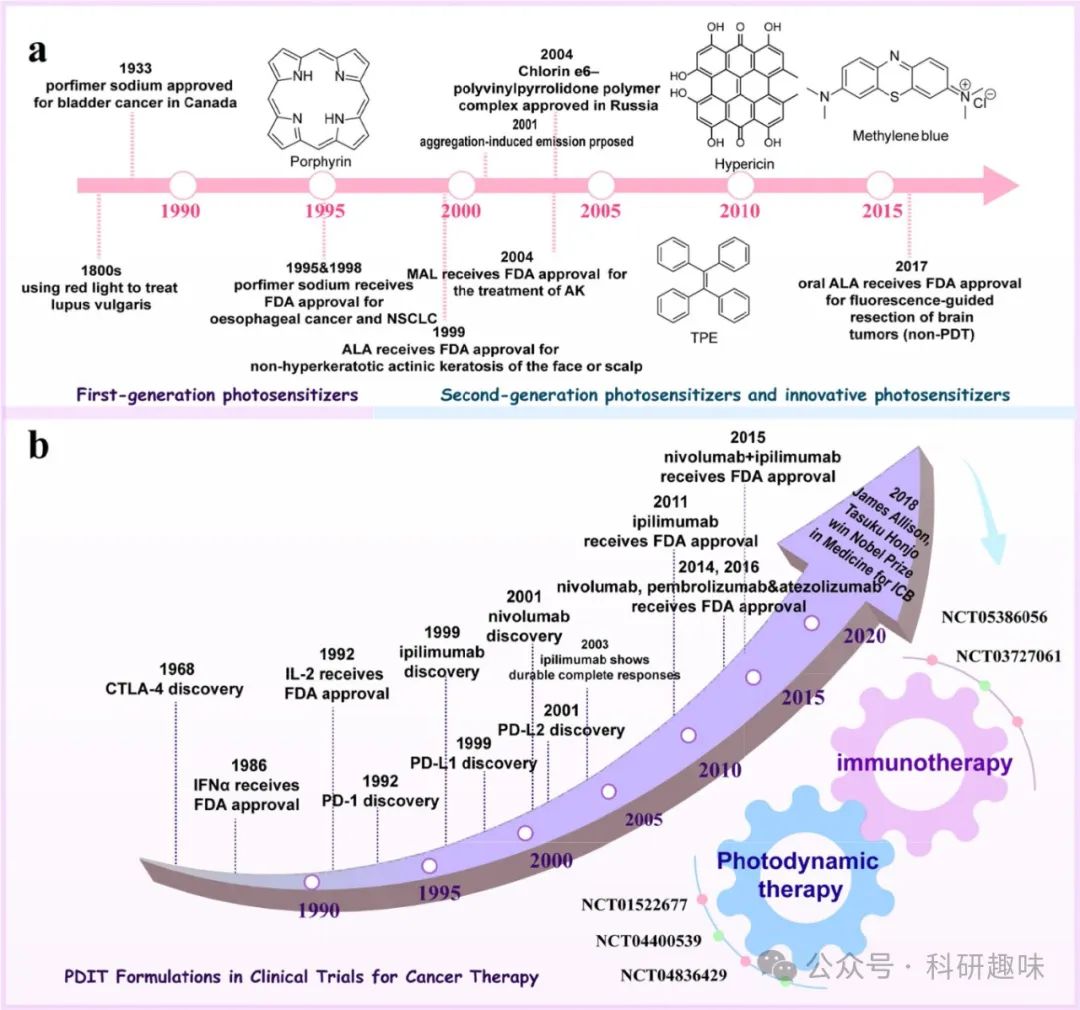图 1. 光动力疗法光敏剂(a)和免疫疗法(主要是免疫检查点抑制剂,b)的监管审批时间表和关键里程碑,以及光动力免疫组合疗法的未来发展方向。