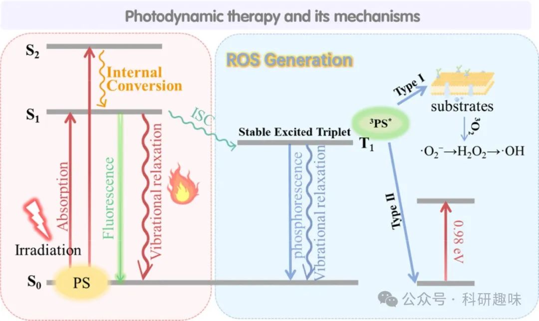 另一方面,PDT的II型机制则依赖于3PS* 与基态氧分子(3O2)之间的能量转移,由于两者电子自旋多重性匹配,3PS*能有效激发3O2至单线态,生成高活性的单线态氧(1O2)。此过程需克服约0.98 eV的能量差,因此要求三重态PS的能量水平必须高于此阈值。