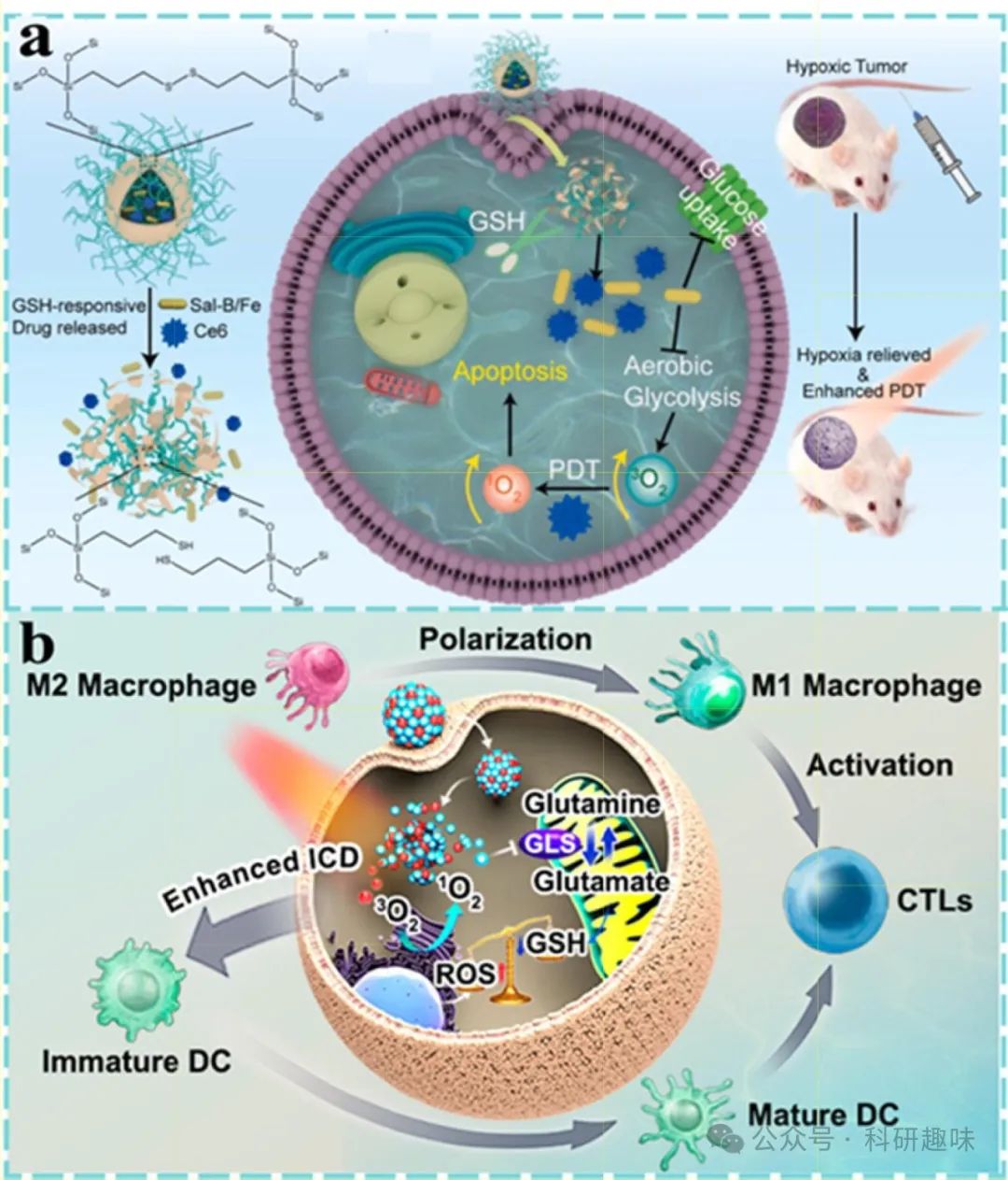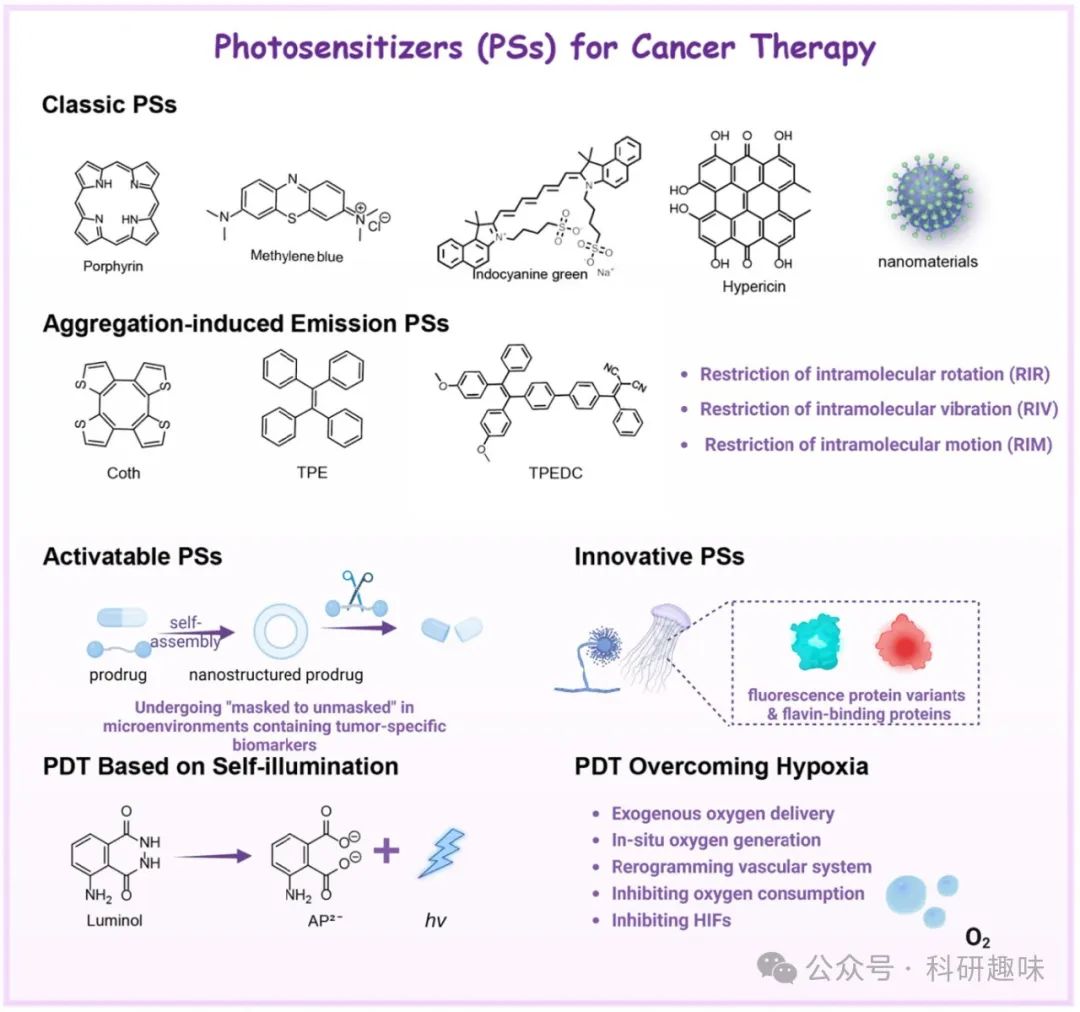 为解决这一难题,研究界已将目光投向了更先进的自发光技术,旨在无需外部光源即可在肿瘤局部产生光能,从而规避了组织穿透力不足的障碍。同时,针对第二类PDT策略(如基于5-氨基乙酰丙酸(5-ALA)和Ce6的光动力疗法),其可能加剧肿瘤内部缺氧环境的问题也备受关注。缺氧环境的恶化会削弱PDT效果,甚至引发治疗抵抗性和肿瘤复发,成为癌症治疗中的一大挑战。
