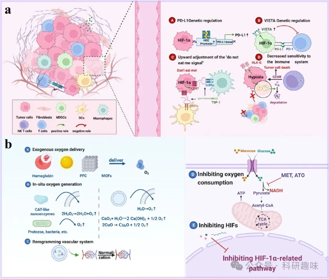 | reduction of oxygen consumption | ATO, Metformin (MET), carrying NO donors | blocking the respiratory electron transport chain inhibition of endogenous O2 consumption , ; inhibition of mitochondrial-associated oxidative phosphorylation (OXPHOS) | Tumors are primarily based on anaerobic glycolysis for energy supply (Warburg effect), partial inhibition of cellular respiration saves only alittle of O2 . |