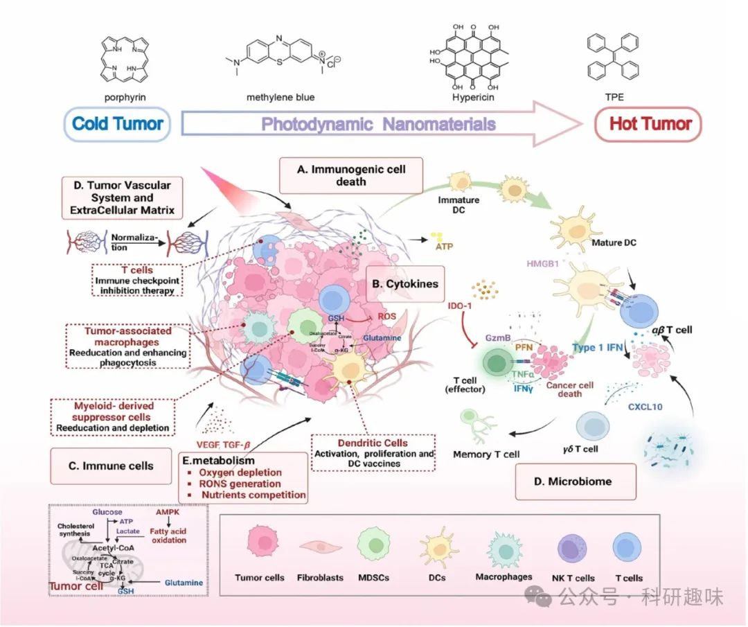 纳米药物作为PDT的载体,其特性如肿瘤特异性靶向、药物封装防止提前释放、以及通过内吞作用促进肿瘤细胞摄取等,为光动力-免疫协同疗法(PDIT)提供了关键且互补的功能。本综述深入探讨了PDIT的原理与模式,通过细胞因子、反应性免疫细胞群、微生物组等典型范例,系统阐述了PDIT对肿瘤相关免疫景观的复杂影响机制。