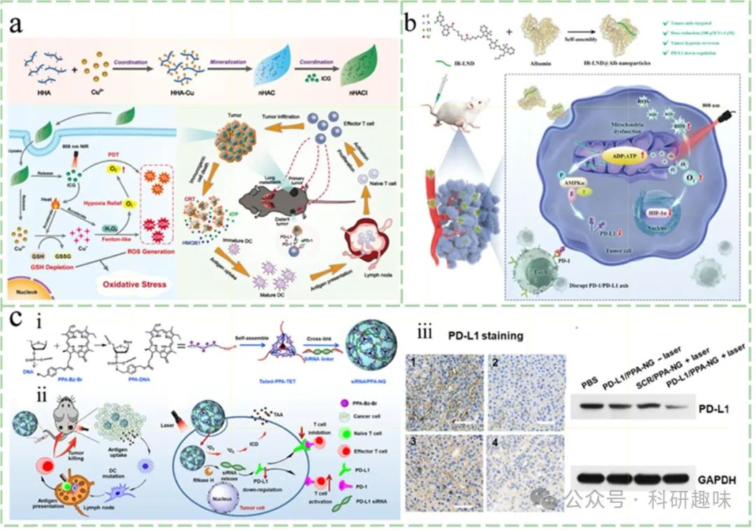 PDT与靶向免疫景观疗法的结合,建立在坚实的生物学基础之上。PDT不仅能够触发多种免疫原性反应,生成损伤相关分子模式(DAMPs),进而激发全身性抗肿瘤免疫反应,还能通过增强抗原呈递、缓解免疫抑制等途径,提升治疗效果。然而,单纯PDT治疗亦存在局限性,如诱导免疫抑制因子产生、细胞凋亡加剧,以及在缺氧及免疫抑制性TIME中疗效受限等。因此,将全身性IT作为PDT的辅助疗法,成为提升治疗效果的新思路。