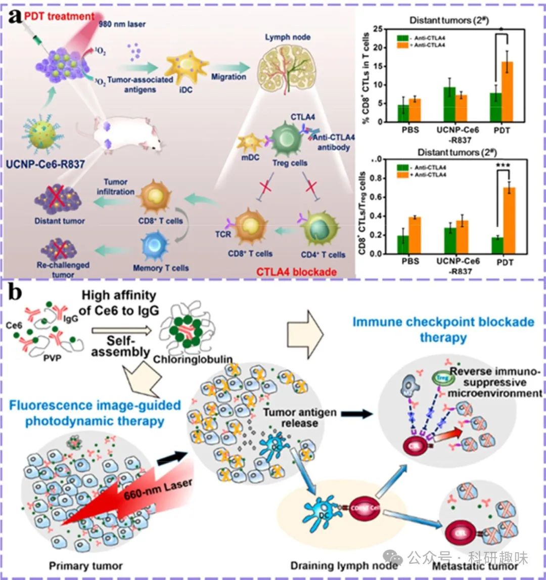 鉴于此,为了安全且高效地激发机体抗肿瘤免疫反应,免疫疗法往往需与多种治疗手段联合探索。其中,光动力疗法(PDT)凭借其独特的细胞毒性直接作用、对肿瘤血管系统的破坏力及激发强大免疫应答的能力,在弥补当前癌症免疫治疗短板方面展现出巨大潜力。近年来,PDT与肿瘤免疫景观之间的相互作用机制成为研究热点,人们普遍认为,将PDT与靶向肿瘤免疫景观的策略相结合,有望成为抗癌治疗的新“金钥匙”。