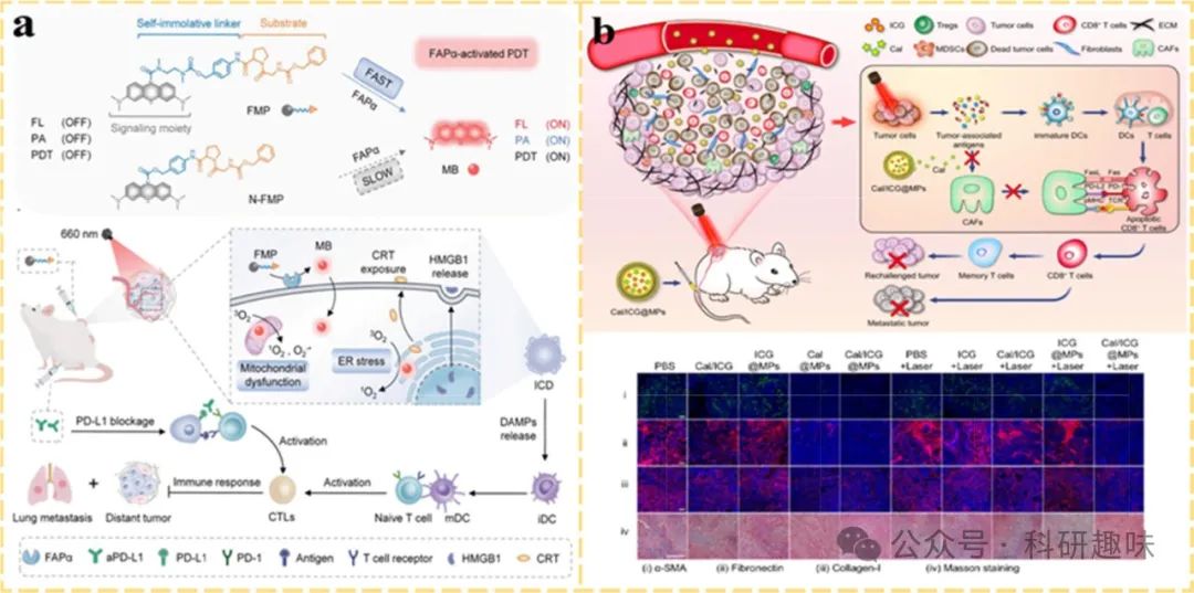 Zhou等人开创性地设计了一种FAPα激活型治疗诊断探针(FMP)(https://doi.org/10.1002/adma.202211485),该探针创新性地融合了光动力疗法(PDT)与CAF特异性识别功能,旨在同时清除CAFs与癌细胞,进而削弱肿瘤细胞的侵袭与迁移能力。FMP由亚甲蓝(MB)基团与FAPα可裂解肽底物构成,后者通过氨基甲酸酯自硫醇连接,确保了探针的靶向性与响应性。在FAPα诱导的肽水解作用下,FMP能够主动靶向肿瘤区域,并释放活性MB分子,从而激活PDT并引导光声成像(PAI),实现了对肿瘤部位的精准治疗与监测。