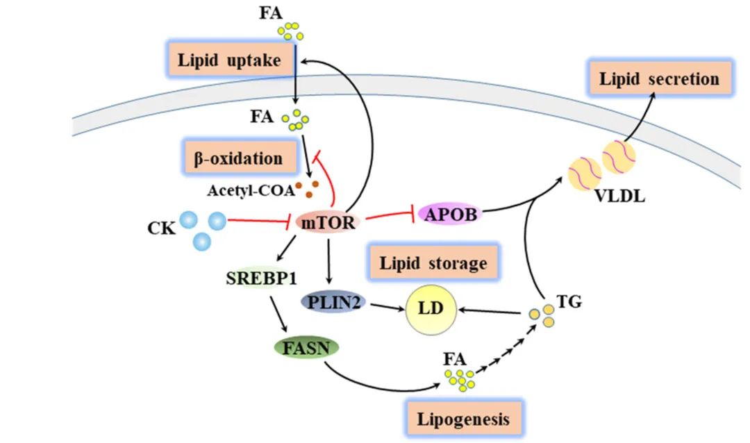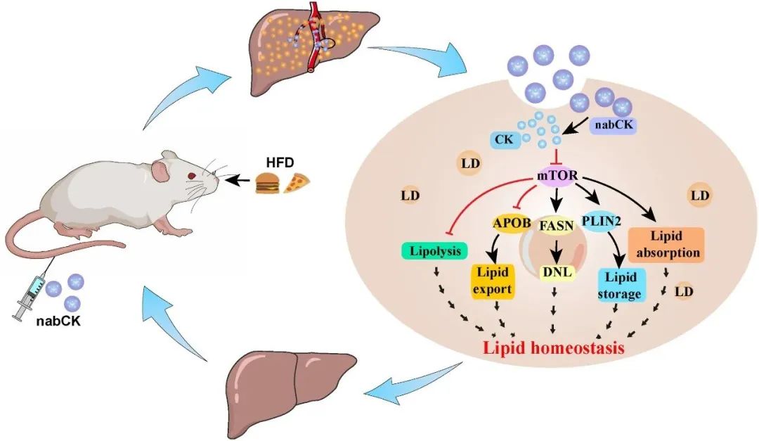 NabCK可以通过纠正多种脂质通路改善脂肪变性的发展过程,包括脂肪吸收、脂肪输出、脂肪酸合成、脂质储存和炎症等通路,从而恢复脂质代谢的平衡。这些通路都受到mTOR的调节,而NabCK可以抑制mTOR的活化,从而恢复脂质代谢的平衡。此外,在高脂饮食诱导的NAFLD小鼠中,NabCK可以减缓脂肪变性和纤维化的发展,并对心脏组织的脂毒性产生保护作用。