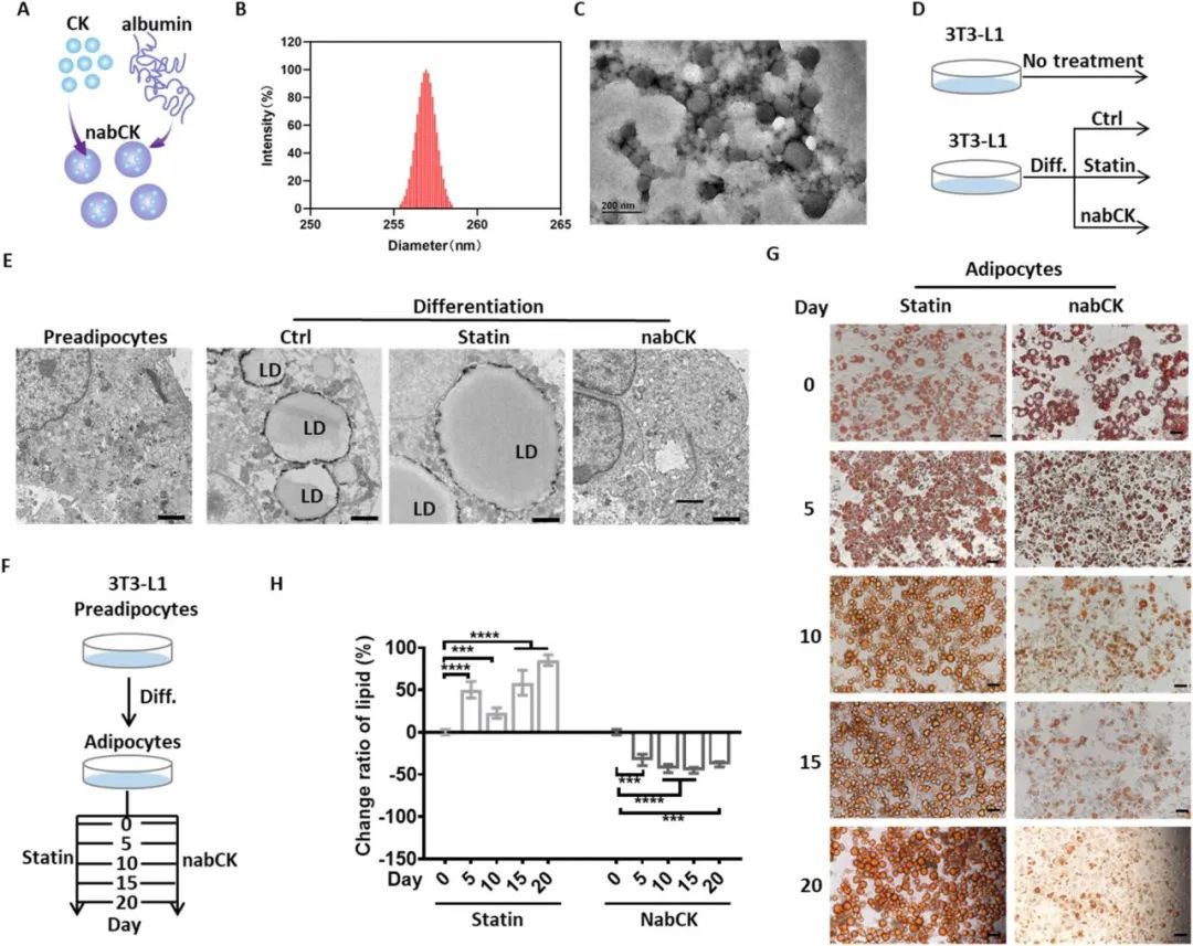 图 1.NabCK 阻止前脂肪细胞分化。(A) 生成 nabCK 的方案。(B) nabCK 的 DLS 分析。(C) 用 TEM 进行形态学分析。(D) nabCK 对分化的预防效果分析程序。在前脂肪细胞 3T3-L1 上进行分化诱导,并在过程中添加 nabCK 或他汀。(E)用 TEM 分析 3T3-L1 细胞的超微结构。刻度线,2 μm。(F)分化的 3T3-L1 脂肪细胞中 nabCK 的逆转效应分析程序。分化后,加入 nabCK 或 Statin 以监测脂质消除效果。每 5 天采集一次图像。(G) 用油红 O 染色测量脂质含量。刻度线,20 微米。(H)与分化脂肪细胞有关的脂质变化比率。提取与脂质(G)相连的油红 O,并在 570 nm 处用吸光度定量。平均值 ± SEM。ns:无显著性,*P < 0.05,**P < 0.01,***P < 0.001,****P < 0.0001。