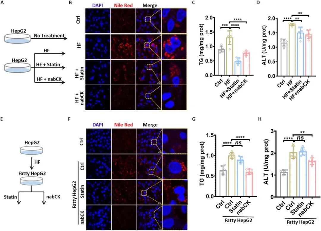 过多的脂质会在肝细胞中积聚并导致脂毒性损伤。作者用高脂肪(HF)培养基诱导 HepG2 肝细胞脂肪沉积。同时,加入nabCK 或 Statin 以评估它们对高脂诱导脂肪肝的预防作用(图 2A)。诱导24小时后,nabCK 能显著抑制高脂诱导的 LDs 形成(图 2B,C),丙氨酸氨基转移酶(ALT)会因肝损伤而升高,已被用作非酒精性脂肪肝的临床生物标志物,因此,作者评估了脂肪肝过程中 ALT 的变化(图 2D)。结果表明,他汀类药物和 nabCK 对ALT 升高有抑制作用(图 2D)。接下来,作者研究了 nabCK 在脂肪肝 HepG2 细胞中的去脂作用(图 2E)。荧光成像显示 HF 处理的 HepG2 细胞中信号增强,表明脂肪变性的发生(图 2F)。用nabCK 处理脂肪细胞 24 小时后,信号明显减弱,这表明 nabCK 促进了沉积脂质的清除。然而,他汀对脂肪肝细胞的脂质消除没有明显影响。定量结果进一步证实了这些发现(图 2G)。所有这些发现都表明,nabCK 可通过防止肝细胞脂质沉积和促进脂肪肝细胞排出脂质来恢复脂质代谢和修复损伤的肝细胞。