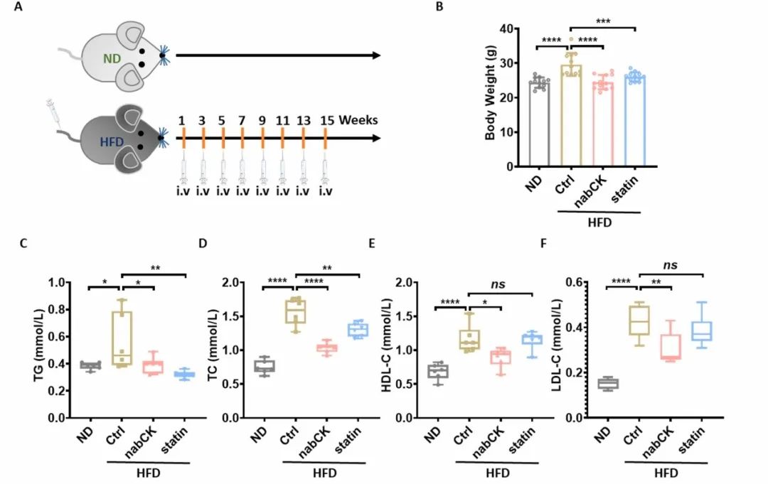 作者在高脂饮食诱导的小鼠模型中验证了NabCK的效果。具体来说,作者测量了小鼠的体重和血液中的脂质生物标志物,包括三酰甘油、总胆固醇、高密度脂蛋白胆固醇和低密度脂蛋白胆固醇。此外,作者还对小鼠的肝脏进行了油红O染色以评估脂质含量,对心脏组织进行了H&E染色以检查心脏损伤,对肝脏组织进行了染色以评估纤维化程度。最后,作者通过相对病变大小的纤维化定量来评估纤维化程度。这些实验结果表明,NabCK可以减缓脂肪变性和纤维化的发展,并对心脏组织的脂毒性产生保护作用。
