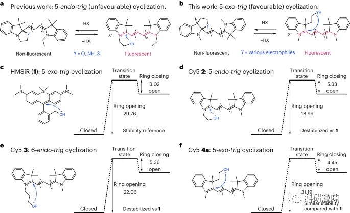 作者首先强调了高效致荧染料的要求,即非结合状态下应以非荧光形式存在,只有与目标结合后才显现荧光。对于基于环化的致荧性,需要确保开环能垒很高和闭环能垒很低。