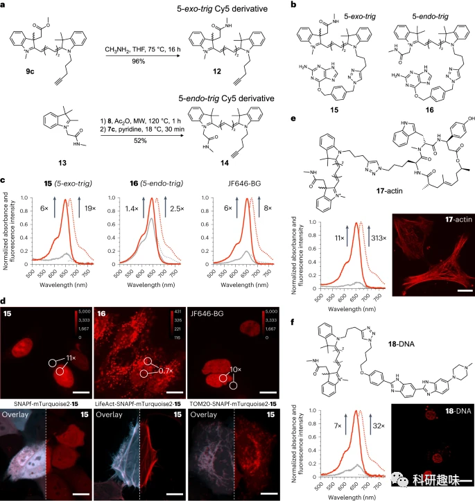 最后,作者测试了与其他大分子靶标结合是否也能诱导探针15的荧光开启。通过制备与肌动蛋白和DNA结合的探针17和18,他们发现这些探针在与大分子靶标结合后能够选择性地显示出强烈的荧光信号。这表明,5-exo-trig Cy5衍生物的致荧性不仅局限于SNAP-tag,其他大分子靶标也能诱导荧光开启。