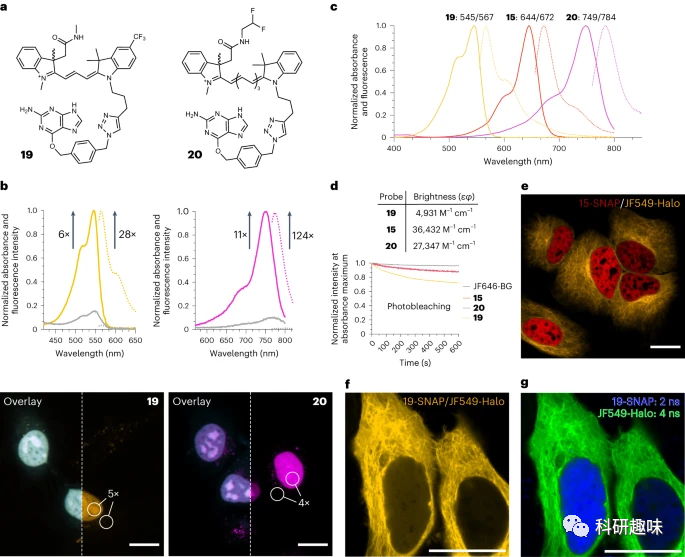 探针15、19和20覆盖了可见光谱的大部分,并延伸至近红外区域。它们与SNAP-tag结合后显示出极好的亮度和光稳定性。在多色成像实验中,通过与含有荧光剂的Cy5染料15和JF549-Halo染料进行成像,证实了这些荧光探针与罗丹明-HaloTag偶联物的交叉性。作者还探讨了Cy3衍生物19和JF549-Halo的荧光信号是否可以通过它们的激发态寿命来区分,通过荧光寿命成像(FLIM)成功地通过它们的平均激发态寿命区分了它们。