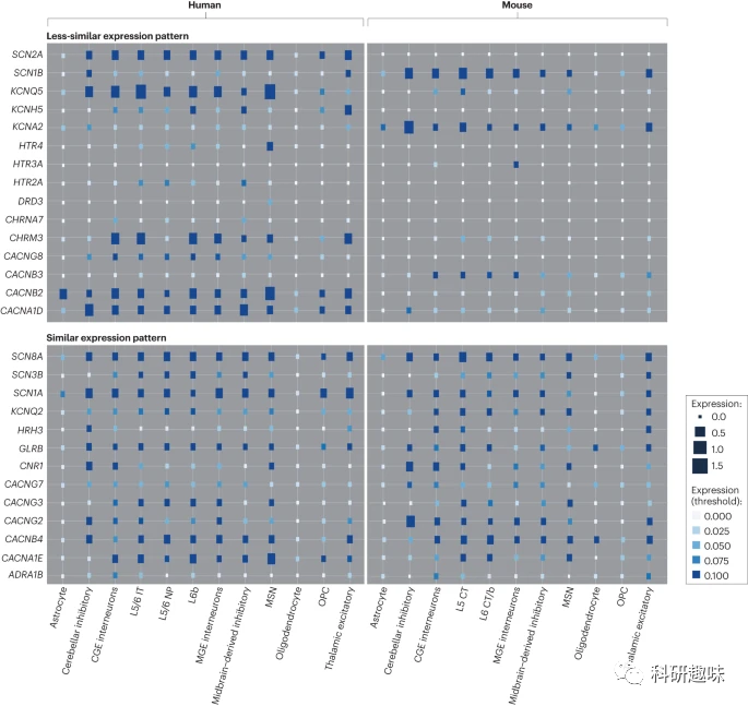 尽管研究显示啮齿类动物和人类大脑中的某些基因表达保持一致,但许多基因的表达存在显著差异。精神病学研究中的许多常见药物靶点在啮齿类动物和人类之间的表达模式也存在差异。因此,从啮齿类动物模型得出的研究结果难以直接转化到人类,导致临床试验的结果难以预测。一些药物靶点的表达模式,如α7-烟碱乙酰胆碱受体、5-羟色胺受体等,在啮齿类动物和人类之间存在显著差异。但也有些药物靶点,如SCN8A、KCNQ2 或 GLRB,表达模式与啮齿类动物模型相符。