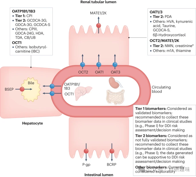 为了解决这一问题,学术界和业界正致力于发现和验证各种药物转运蛋白的生物标志物。这些标志物包括肝脏(OATP1B1、OATP1B3 和 OCT1)和肾脏转运蛋白(OAT1、OAT3、OCT2、MATE1 和 MATE2K)。2018年的一份重要出版物对这些生物标志物的特性进行了总结,并为如何识别和验证这些标志物提供了指导方法,以评估特定的DDI。