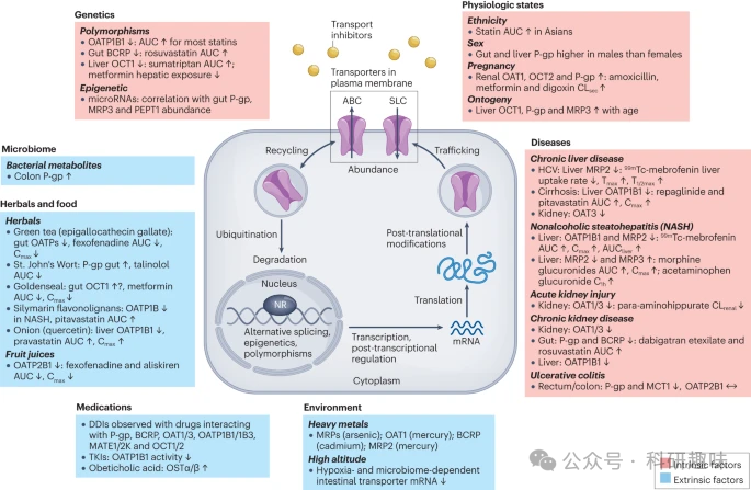 图 2:影响药物转运蛋白丰度和/或活性的内在(粉色)和外在(蓝色)因素以及可能涉及的机制,包括特定的调节途径和/或抑制作用。