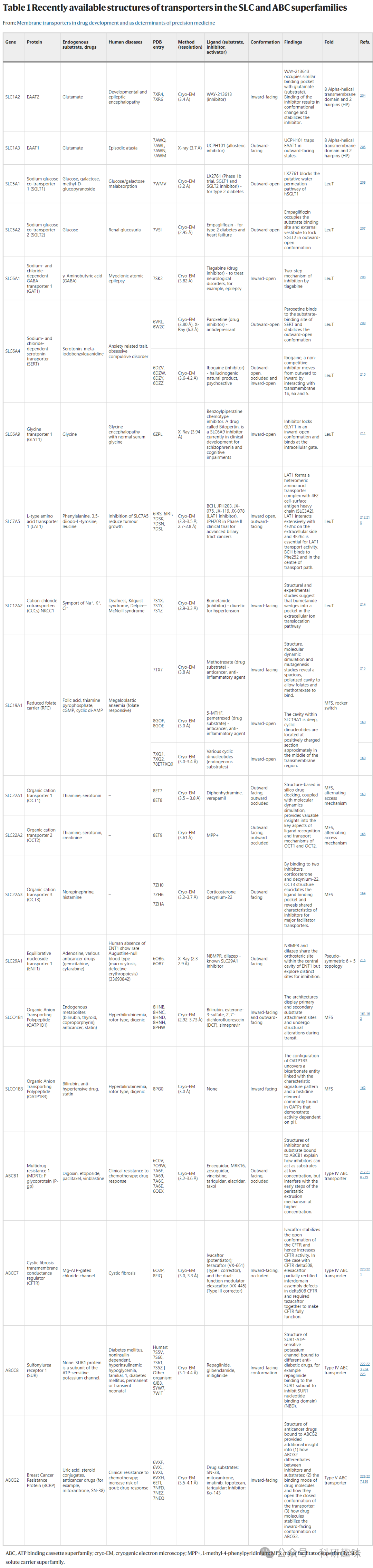 自2022年ITC综述以来,已有一些关于SLC和ABC转运蛋白的新结构发表(表1)。其中,一些与药物开发特别相关的结构包括在甲氨蝶呤处置中发挥作用的还原叶酸载体SLC19A1;有机阴离子转运多肽SLCO1B1和SLCO1B3;以及有机阳离子转运蛋白SLC22A1、SLC22A2和SLC22A163、164等。这些转运蛋白在多种药物和内源性分子的处置中发挥着关键作用。