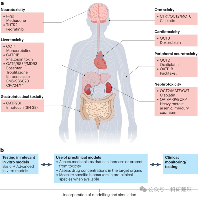 本节将重点介绍转运蛋白介导的药物毒性的典型实例(图6a)、引导这些毒性效应的新方法以及可用的风险评估工具。通过深入了解这些关键概念,我们将更好地理解药物转运蛋白在药物毒性和DDI中的作用,并为其风险评估和管理提供更准确的指导。