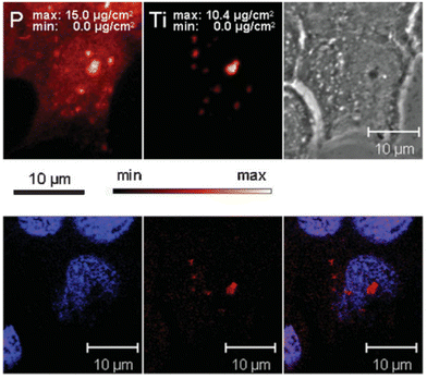 图 11(上)用 TiO2-DNA 纳米共轭物处理的细胞中磷和钛分布的 XFM 图像。(下图)用 DAPI(蓝色)和 TAMRA(红色)标记的同一细胞的光学荧光图像。