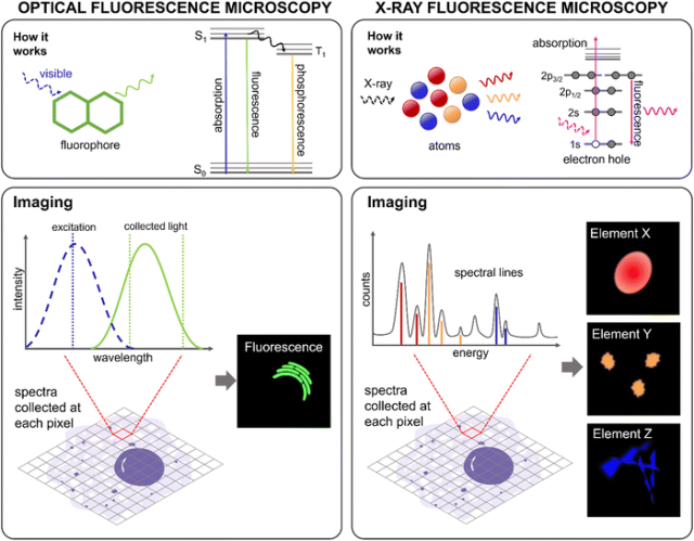 图 2 光学荧光显微镜(OFM)和 X 射线荧光显微镜(XFM)的原理。在光学荧光(左图)中,荧光团吸收可见光光子进入高能态。弛豫时,发出可见光光子。所使用的激发光源必须具有适当的激发波长(蓝色虚线),并在适当的范围内收集发射光(绿色线)。光学荧光显微镜收集固定波长范围内的光强,并对成像区域的每个像素进行收集。像素排列成图像,显示荧光分子在整个细胞中的分布。在 X 射线荧光(右图)中,X 射线光子激发核心电子,产生电子空穴。该空穴迅速被能量更高的电子填满,从而发射出具有 X 射线能量的光子,每种元素的光子能量各不相同。X 射线荧光显微镜收集这些光子,生成光谱,在成像区域的每个像素上都会出现不同元素的峰值。现代分析包括拟合每个空间像素的 X 射线光谱中的所有发射峰,形成显示整个细胞中元素分布和浓度的图像。