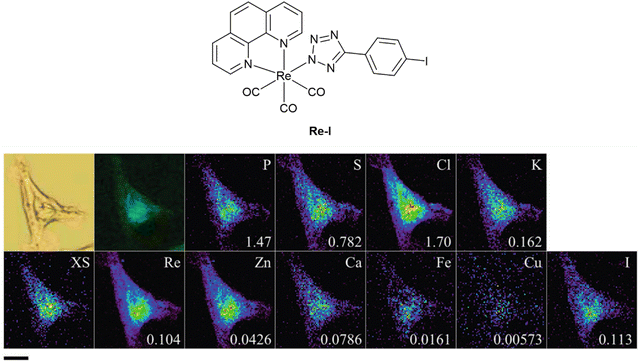图 10 22Rv1 细胞中多模态复合物 Re-I 的相关成像,显示明视野(左上)、表观荧光图像(左下)和 XFM 测量的其他元素图。每个元素上的数值表示最大元素面积密度(微克厘米-2)。