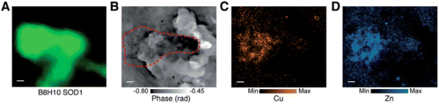 图 5 帕金森病患者人脑组织中 SOD1 蛋白聚集体的代表性多模态图像:(A) Cy3 荧光图,(B) X 射线层析图,(C) XFM 铜图和(D) XFM 锌图。