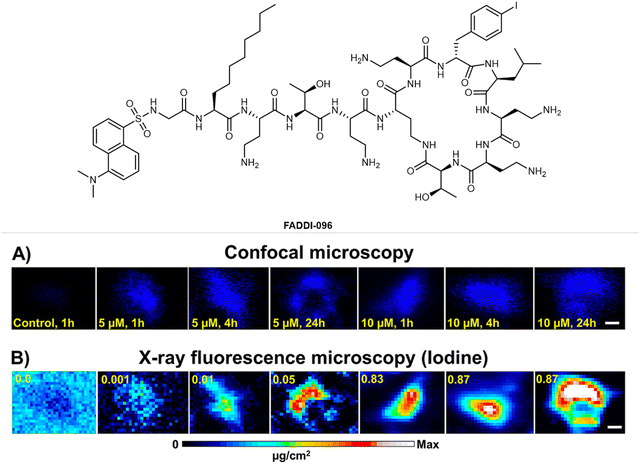 图 9 抗生素衍生物 FADDI-096 在 A549 细胞中的相关成像,用氯化丹酰氯荧光团和碘原子标记,图像收集时间如图所示。(A) OFM 图像,(B) 相应的碘 XFM 图像。