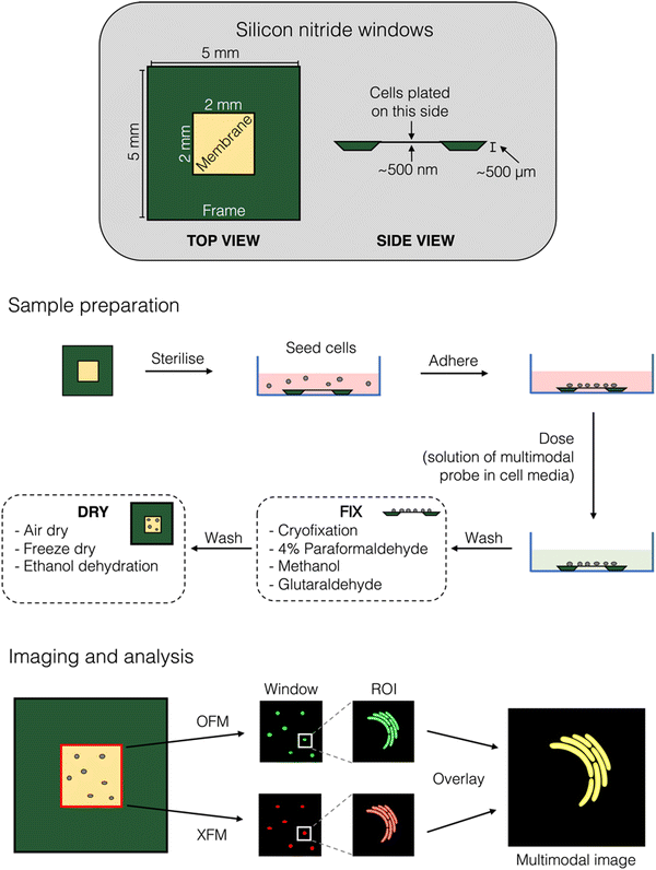 图 3 相关光学荧光显微镜和 X 射线荧光显微镜成像工作流程示例。(上图)细胞 XFM 研究首选的氮化硅膜(窗口)示意图,并标注了一些典型尺寸。(中)制备含有多模态成像探针的细胞样本的工作流程。(下图)相关成像的成像工作流程。