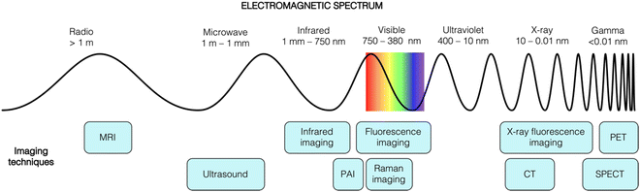 图1. 基于各种波长光的成像技术。MRI = 磁共振成像,PAI = 光声成像,CT = 计算机断层扫描,SPECT = 单正电子发射计算机断层扫描,PET = 正电子发射断层扫描。