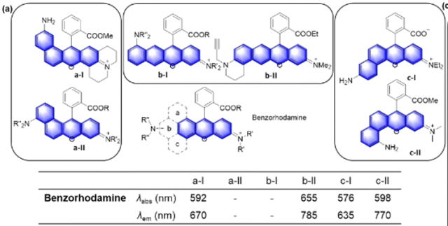延长荧光团的π-共轭长度是改变其吸收/发射最大值的常用方法。这里以苯并罗丹明染料为例,根据苯环的部位,它们可分为线型和弯曲型苯并罗丹明染料:苯并罗丹明 a-I、32b-II、33c-I34 和 c-II35。这些苯并罗丹明的发射波长明显红移,波长超过 635 nm,线性 b-II 的波长达到 785 nm。