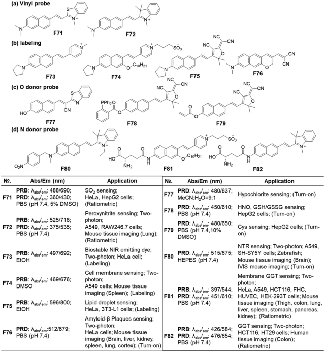 另一个需要提及的一般性问题是,随着π-共轭长度的增加,探针即使在微摩尔浓度下也可能出现聚集导致淬灭(ACQ)现象,因此,在生物应用中始终需要检查探针的细胞聚集行为,而聚集诱导发光(AIE)探针可以在一定程度上解决这个问题。