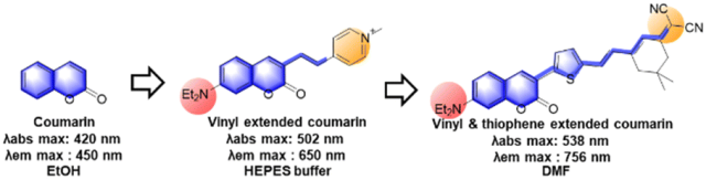 考虑到香豆素是典型的 ICT 染料,除了延长 π 共轭长度外,我们还可以通过提高供体/受体的能力来诱导其发射波长的红移。1984 年,Jones 和合作者研究了带有几种不同电子供体和受体基团的香豆素染料的光物理特性。结果发现,仅修饰供体和受体不足以使香豆素的发射波长超过 600 nm(λem)。因此,需要进行 π 延伸,才能产生在红/远红或近红外区域发光的香豆素衍生物。
