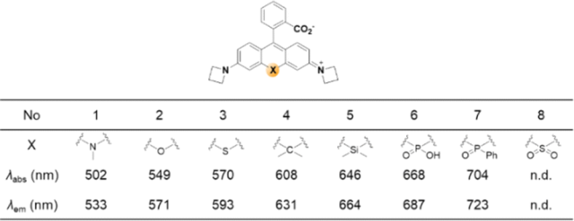 氧杂蒽染料的 C-9 中心原子可以来自碳族,从而产生各种氧杂蒽类似物,也可以来自氮族或铬族(图 4)。在氧杂蒽染料中,中心氧原子的置换会导致不同的发射位移,其基本机制也各不相同。对于第 14 和 15 组原子,有解释说 X 原子(Si、Ge、Sn 和 P)可以通过外环 X-C 或 XO 键(例如 -SiMe2、-P(O)OH、-P(O)Me 和 -P(O)Ph)的 σ*-π* 共轭与附近荧光团的π* 轨道之间的σ*-π* 共轭来稳定 LUMO 能级。对于第 16 组原子,杂原子的孤对电子占位和共振稳定性是激发能量的主要决定因素:S、Se 或 Te 的 X 原子显示出更高的孤对电子占位,这降低了激发能量,从而导致更长的吸收波长。图 5 列出了中心 C-9 上含有胺(氮)、硫、砜、碳、硅、膦酸盐或氧化膦的罗丹明类似物的最大吸收和发射波长。通过取代中心原子,发射波长红程度依次为 N、O、S、C、Si 和 P。加上已知的氮杂环丁烷基团的红移效应,-P(O)Ph 类似物的最大发射波长为 723 nm(pH 7.3 HEPES 缓冲液)。需要注意的是,用硅基(-SiR2)取代 C-9 氧原子以获得深红/近红外发射染料的方法受到了广泛关注,这可能是由于合成较为简单。例如,用二甲基硅基取代 C-9 氧原子会增加 C-10 的亲电性。因此,与相应的罗丹明类似物相比,螺内酯开环是在极性更高的介质中进行的。
