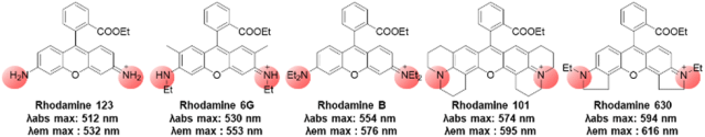 推-拉型荧光物质中的烷基胺充当电子供体基团,与它们的亚胺形式结合,显著影响荧光物质的发射特性。当从罗丹明 123(–NH2)转变到罗丹明 6G(–NHEt)和罗丹明 B(–NEt2)时,其发射波长分别从532 nm移动到553nm和576nm。二烷基胺取代的罗丹明(如罗丹明 B、罗丹明 101 和罗丹明 630)的发射波长排序为:二乙胺(576nm)< 久洛尼定(595nm)< 乙基吲哚(616nm)(见图 3)。从中可以看出,更好的电子供体氨基团有助于实现这些罗丹明染料最大发射波长的红移。然而,仅通过修改单氨基取代基不能使最大发射波长达到深红区,因此,在必要的情况下可以使用“二氨基”取代基。