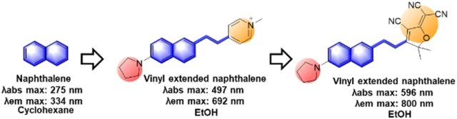 萘基荧光分子发射波长的调控与香豆素前面两种染料类似,都可以通过修改电子供体/受体、增加π-共轭长度来实现,强的吸电子基团如三氰基呋喃环甚至可以将分子的最大发射波长推到800 nm。