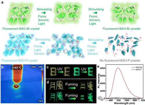 图 6 (a) 两个分子在外部刺激下的堆积状态变化示意图。(b) 紫外线照射下 BAO-P 晶体的红外热成像照片。(c) 紫外光照射下 BAO-Br 和 BAO-P 小晶体变化的物理图像(从左到右:室内光照下和 365 纳米光照下)。(d) BAO-Br 和 BAO-P 小晶体在溶剂熏蒸下变化的物理图像(从上到下:室光下和 365 纳米光下)。(e) 两种晶体在溶剂刺激下的聚光光谱.