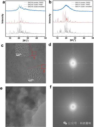 图 3(a) BAO-Br 的 XRD 图样;(d) BAO-P 的 XRD 图样。(c) BAO-Br 粉末的 HRTEM 图像。(d) BAO-Br 的电子衍射图。(f) BAO-P 的电子衍射图案.
