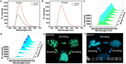 图 2. (a) BAO-Br 和 BAO-P 晶体的聚光光谱。(b) BAO-Br 和 BAO-P 粉末的 PL 光谱。(c) BAO-Br 晶体在研磨过程中的 PL 光谱变化。(d) BAO-P 晶体在研磨过程中的聚光光谱变化。(e) 磨削过程中 BAO-Br 的荧光物理图像。(f) 磨削过程中 BAO-P 的荧光物理图像。