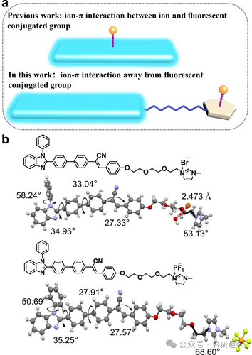 当前研究主要聚焦于在共轭分子中引入不同离子以探究其对发光性能的影响。这些分子中,离子位于发光共轭基团上,与发光共轭基团产生离子-π相互作用。然而,对于离子-π相互作用与荧光共轭基团之间存在柔性烷基链间隔时,分子聚集体在刺激下的发光行为的研究尚显不足。