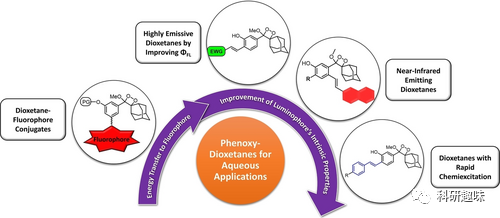 相比于荧光成像,化学发光技术有其局限性,如信号较低、探针不可逆以及对化学反应产生高能中间产物等。然而,近年来研究者们通过利用Schaap二氧杂环丁烷等高能中间体,重新探索了化学发光技术。Shabat小组等人发表了一系列关于具有高发射效率和长发射波长的Schaap二氧杂环丁烷衍生物的文章,展示了其潜在应用。 图6. 开发适用于生物成像的苯氧基-二氧杂环戊二酮化学发光探针的方法和进展